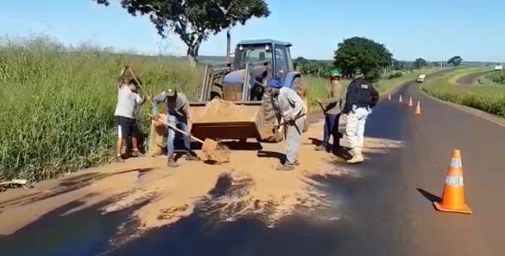 O caminhão seguia de Água Boa (MT) para Uberaba (MG) carregado com soja quando uma turbina quebrou e derramou 40 litros do óleo do motor, alastrando por cerca de 100 metros.